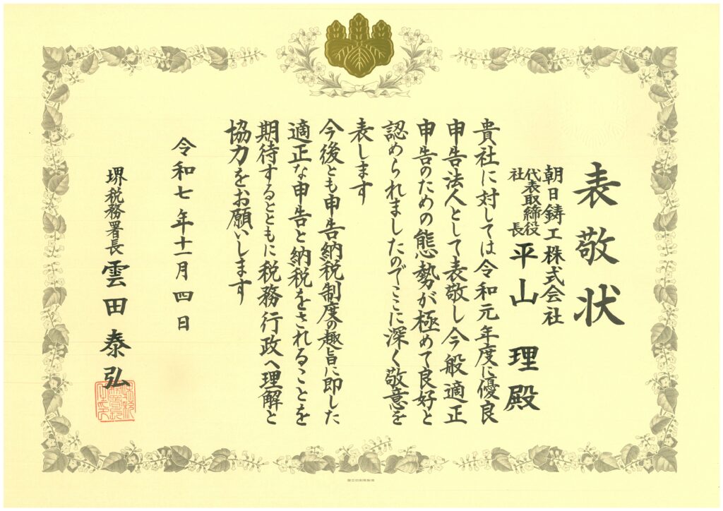 11月4日、堺税務署より「優良申告法人」としての表敬を受けました。今回で4度目の表敬となり、日頃からの適正な申告・納税への取り組みが評価されたものと受け止めております。
